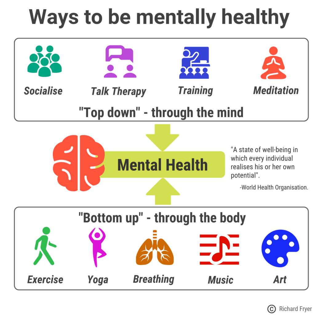 The first are ‘top down’ approaches where thinking and talking techniques are used to increase wellbeing. These might include talking with a psychologist but also include socialising with mates, learning new skills or even some types of mindfulness meditation. The second set of activities can be called ‘bottom up’ approaches as they work through the body to change the mind. These include exercise, yoga, diaphragmatic breathing, music and other forms of play. You may also recognise that some activities are a combination of top down and bottom up – mindfulness practise that utilises breathing as a way of contacting the present moment non-judgementally is one example.